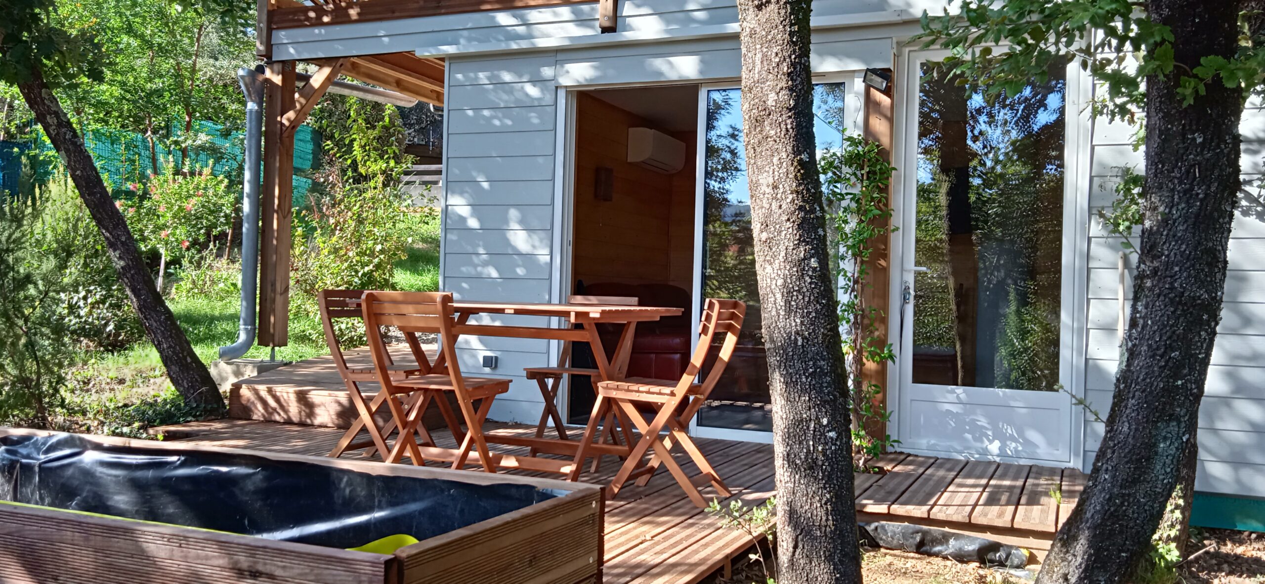 • terrasse : table bois 4 chaises, et 2 fauteuils relax